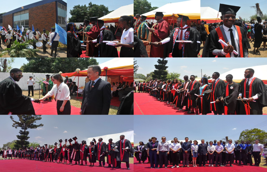 贊比亞當(dāng)?shù)貢r(shí)間10月6日,中國(guó)-贊比亞職業(yè)技術(shù)學(xué)院(以下簡(jiǎn)稱:中贊職院)首屆畢業(yè)典禮在贊比亞盧安夏隆重舉行。贊比亞科學(xué)技術(shù)部技術(shù)教育與培訓(xùn)司司長(zhǎng)Simumba Alex 、贊比亞職業(yè)技術(shù)教育管理局局長(zhǎng)Cleophas Takaiza、贊比亞盧安夏地區(qū)專員 Oncemore Ngonomo、中國(guó)有色集團(tuán)在贊比亞出資企業(yè)中色盧安夏總會(huì)計(jì)師余新亮、中色盧安夏贊方副總經(jīng)理Robert Kamanga蒞臨現(xiàn)場(chǎng)并致辭。中國(guó)教育部職業(yè)教育與成人教育司副司長(zhǎng)林宇、北京工業(yè)職業(yè)技術(shù)學(xué)院等10所試點(diǎn)合作院校領(lǐng)導(dǎo)發(fā)表視頻致辭,各院校教師代表現(xiàn)場(chǎng)出席畢業(yè)典禮。