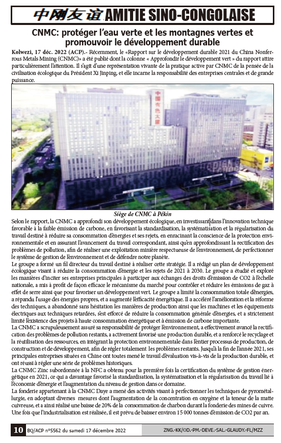 剛通社是中南部非洲最具權(quán)威主流媒體之一,創(chuàng)辦有《中剛友誼》專欄。這是在繼2021年5月五連載發(fā)布《中國有色集團剛果(金)可持續(xù)發(fā)展報告》之后,再一次全媒體集中宣傳推介中國有色集團,形成了良好的國際輿論環(huán)境。? ? ?